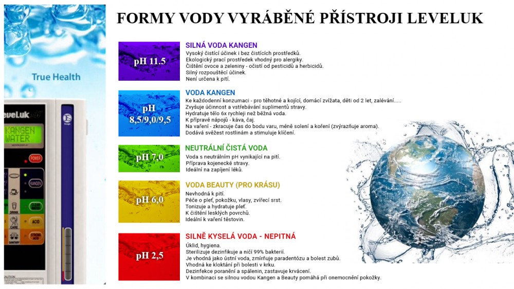 Přístroj LEVELUK je ideální pro trvalý komfort Vaší rodiny bez nutnosti nošení lahví s vodou pro domácí i komerční využití i se zdravotními certifikáty pro umístění do zdravotních zařína úpravu pitné vody u Vás doma na kangen vodu tzn. pro trvalé zdraví Vaší rodiny či pro zlepšení nejen sportovních výkonů - informace a podrobná prezentace je vždy osobně jen pro Vážné zájemce!